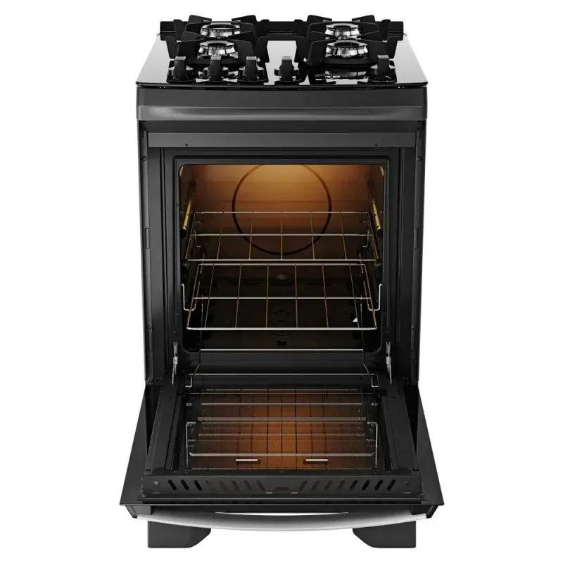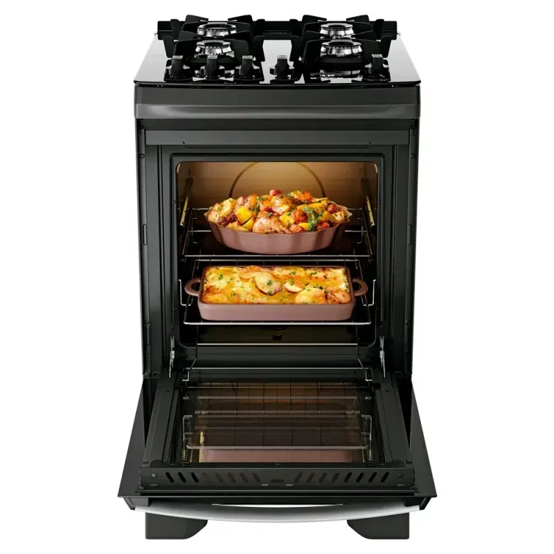 O puxador em alumínio escovado, além de ergonômico, traz sofisticação ao design do fogão. Com duas prateleiras deslizantes: a inferior facilita a retirada dos alimentos, enquanto a superior, com altura ajustável, se adapta às necessidades de cada preparo. O visor amplo do forno permite acompanhar o preparo sem precisar abrir a porta e o acabamento Limpa Fácil deixa a limpeza ainda mais rápida e descomplicada.