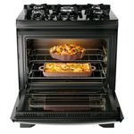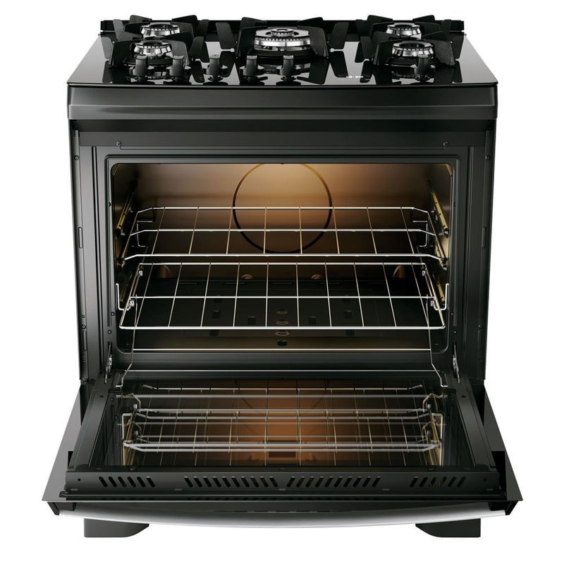O puxador em alumínio escovado, além de ergonômico, traz sofisticação ao design do fogão. Com duas prateleiras deslizantes: a inferior facilita a retirada dos alimentos, enquanto a superior, com altura ajustável, se adapta às necessidades de cada preparo. O visor amplo do forno permite acompanhar o preparo sem precisar abrir a porta e o acabamento Limpa Fácil deixa a limpeza ainda mais rápida e descomplicada.