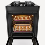 O sistema de duas prateleiras - uma que desliza sozinha e outra com altura ajustável - facilita colocar e retirar os alimentos, enquanto o visor amplo permite acompanhar o ponto das receitas sem abrir a porta, mantendo a temperatura ideal.